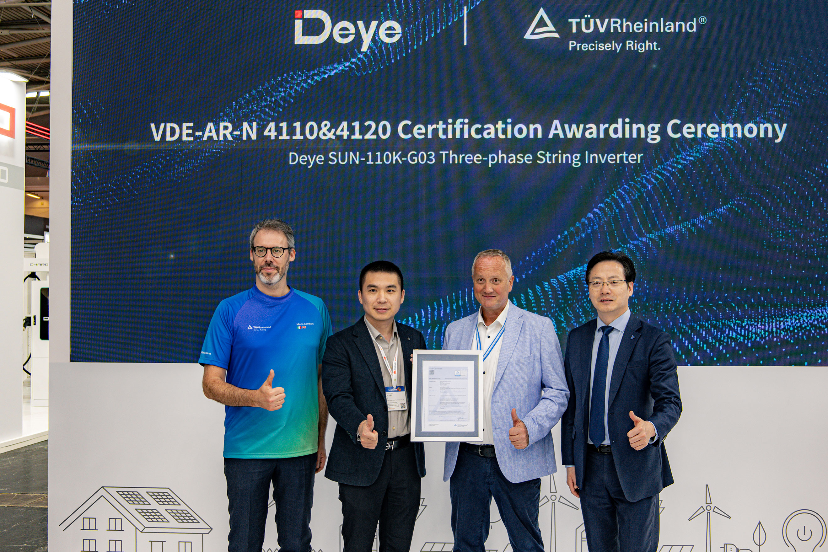 El 7 de mayo, una autoridad internacional de pruebas, inspección y certificación de terceros, Tüv Rheinland, otorgó al inversor trifásico de 110kW VDE-AR-N 4110 y 4120 Certificaciones, validando su cumplimiento con riguroso Estándares de conexión de cuadrícula de medio voltaje y alto voltaje alemán. El compromiso de Deye con la seguridad y la confiabilidad ha sido reconocido paramalmente de nuevo. Este inversor está optimizado para tejidos comerciales medianos a grandes y sistemas de energía solar fotovoltaica montada.