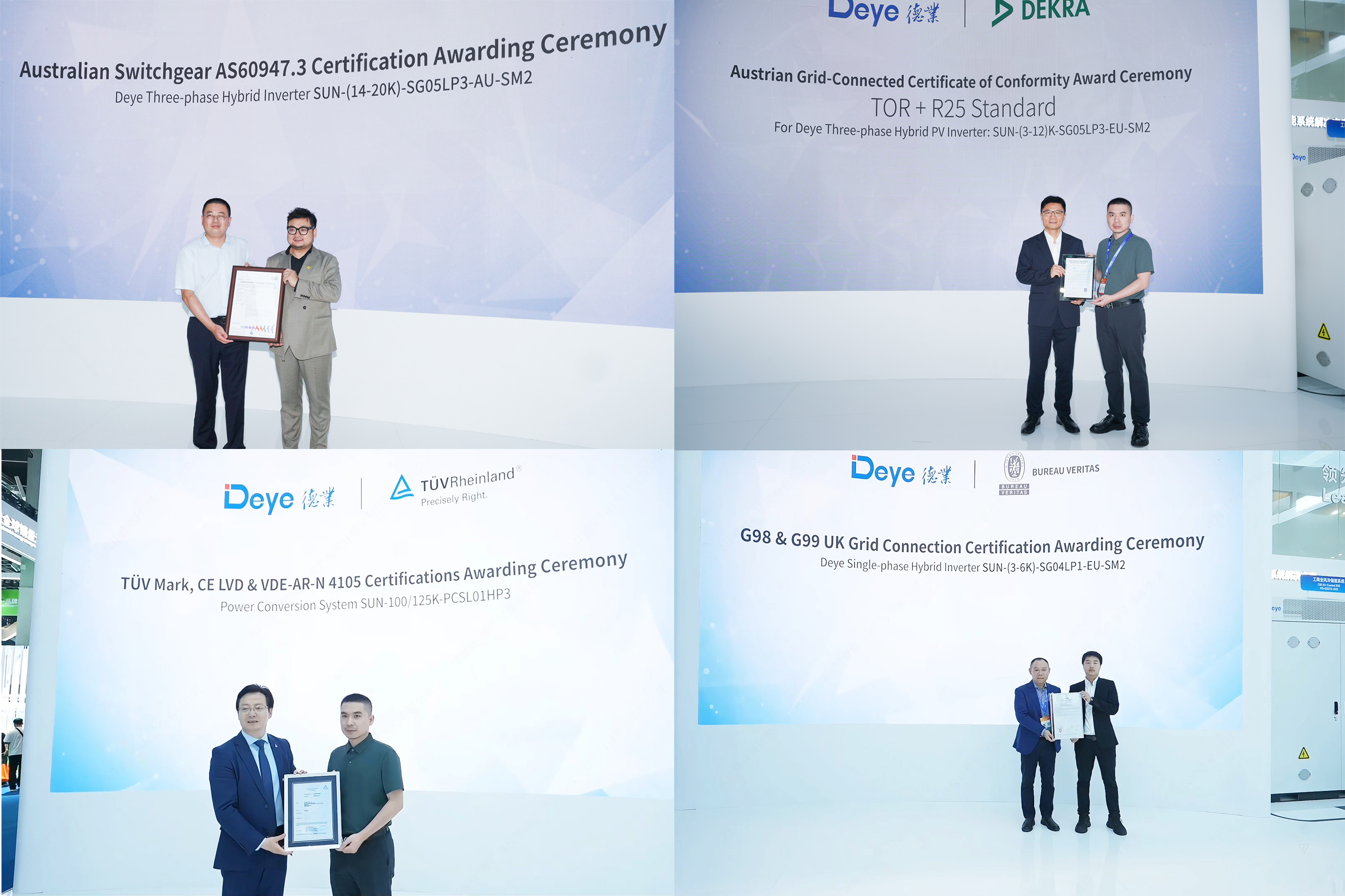 Del 11 al 12 de junio, los principales organismos de certificación internacional (TTüV Rheinland, Bureau Veritas, Dekra y SGS) adquirieron múltiples productos Deye con certificaciones de seguridad para Alemania, el Reino Unido, Austria y Australia. Este hito subraya la competitividad global de Deye y el compromiso inquebrantable con la calidad y la satisfacción del cliente.